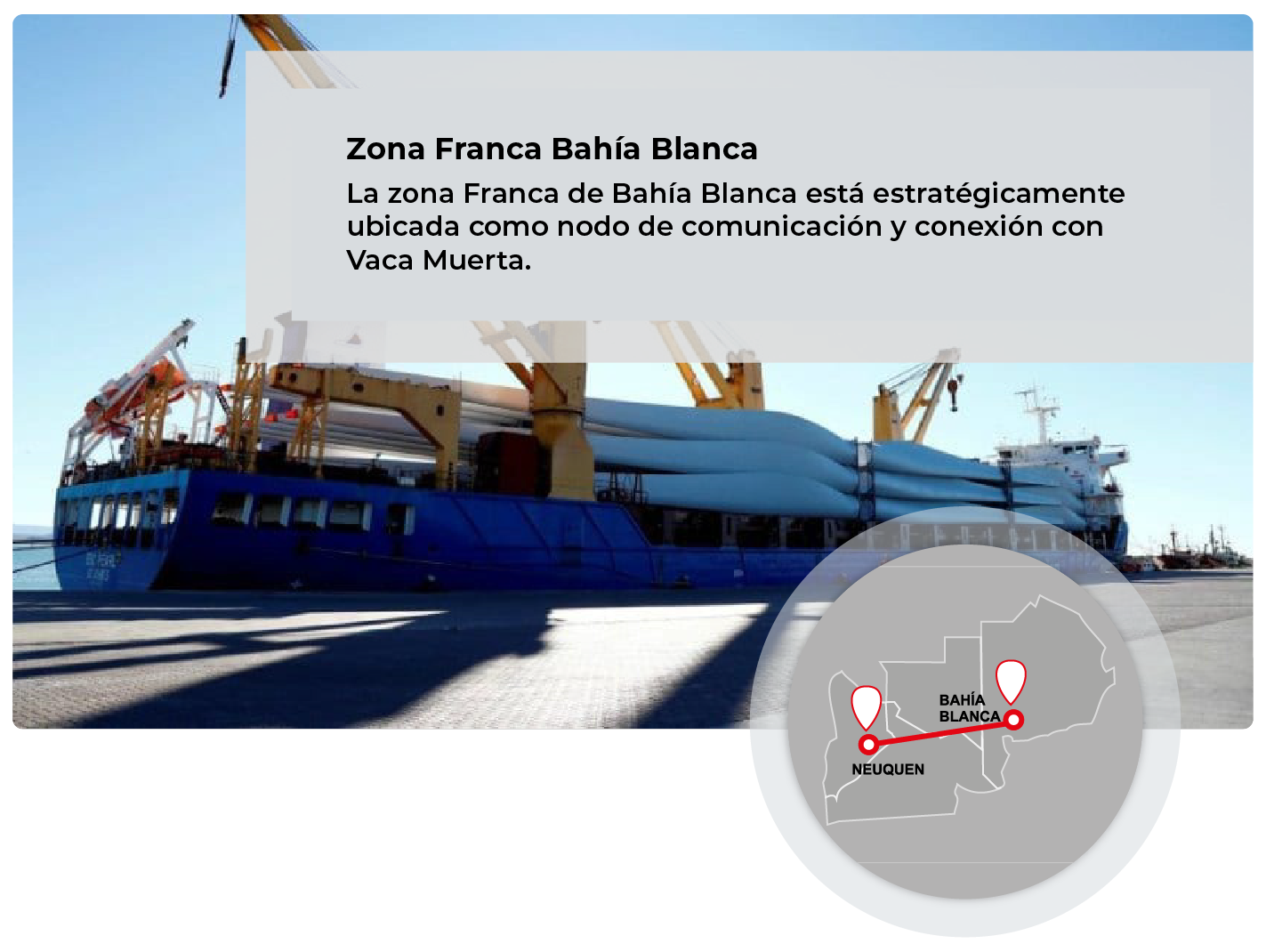 Nos encontramos en pleno desarrollo de un proyecto de Logística integral para la provisión al sector Oil & Gas instalados en Vaca Muerta dándole servicios a empresas extranjeras, con la figura de “a solo efecto de su almacenaje” las cuales quieren posicionar sus productos en territorio franco para dar entrega inmediata y solucionar los requerimientos a las empresas relacionadas o que dan servicios al sector Energético, como el petrolero, eólicos y solares.